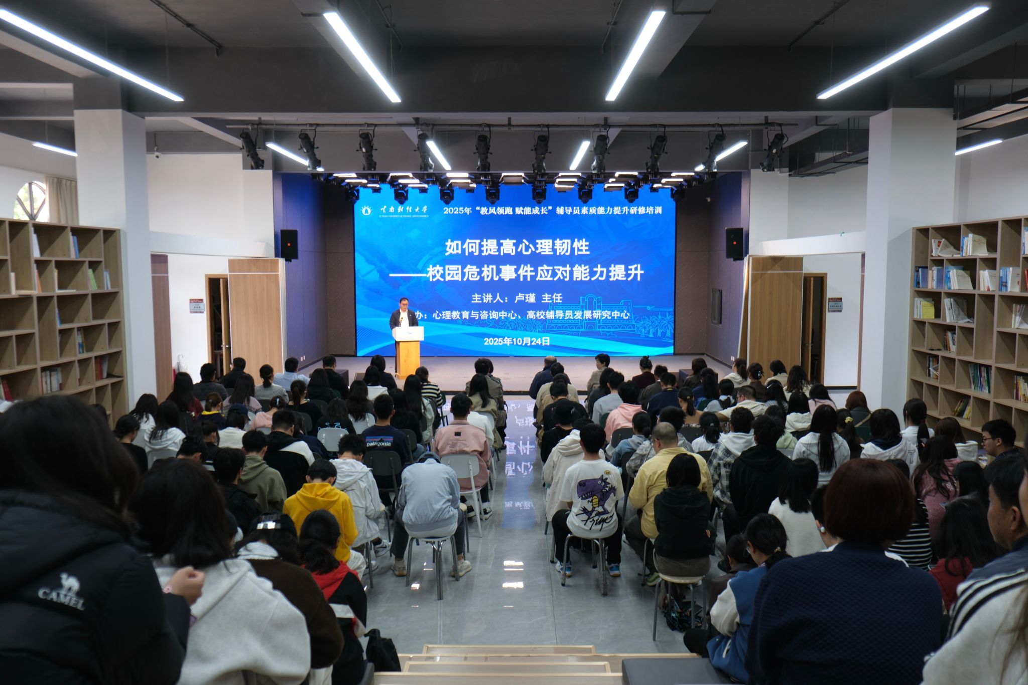 为进一步提高辅导员队伍和学生对心理问题的认识,传播心理健康知识,根据全省心理健康知识讲座巡讲工作安排,10月24日,昆明医科大学第一附属医院精神科主任卢瑾教授应邀到学校开展“如何提高心理韧性——校园危机事件应对能力提升”专题培训。培训由省卫生健康委员会、省教育厅、省总工会主办,我校学生处承办。学生服务中心专职副主任、学生工作部副部长王帅主持培训会。