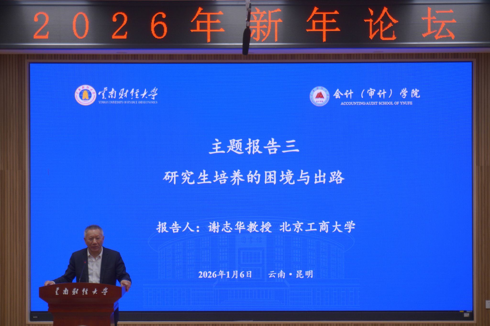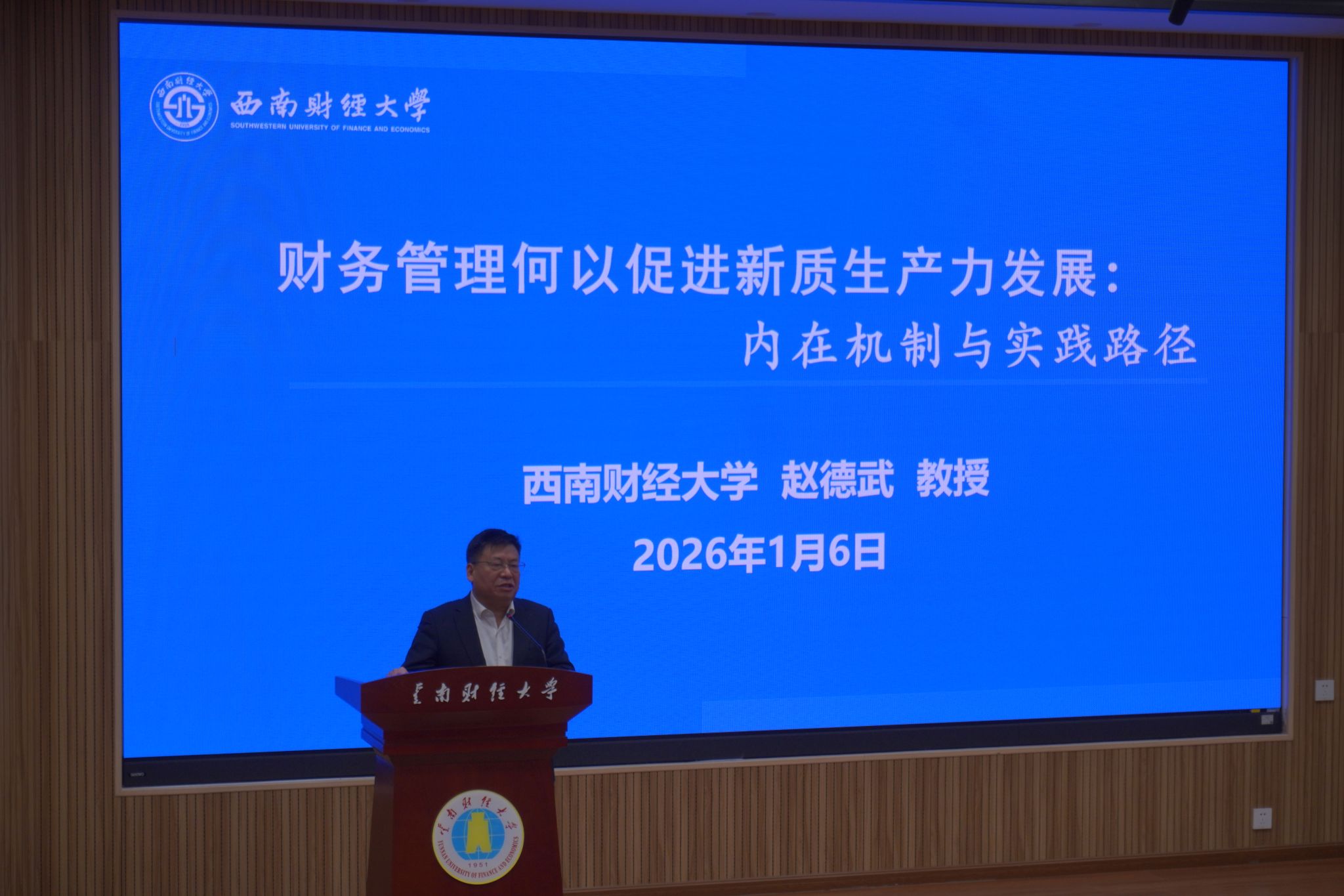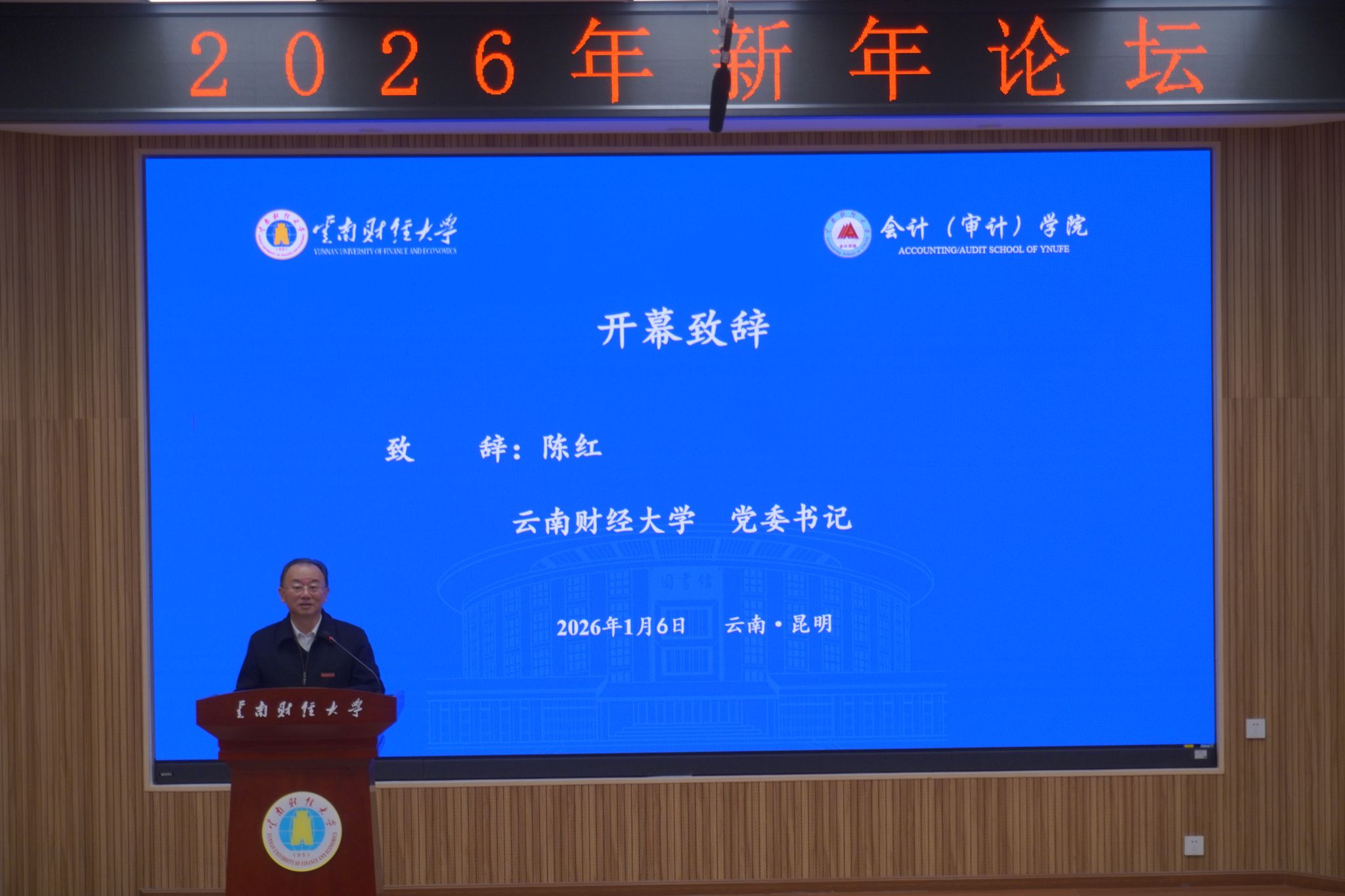 1月6日,“新时代·新征程:财会创新与区域经济发展”2026年新年论坛在我校龙泉路校区举办。本次会议由学校主办,会计(审计)学院承办。校党委书记陈红教授致开幕词,副校长余怒涛教授主持开幕式。