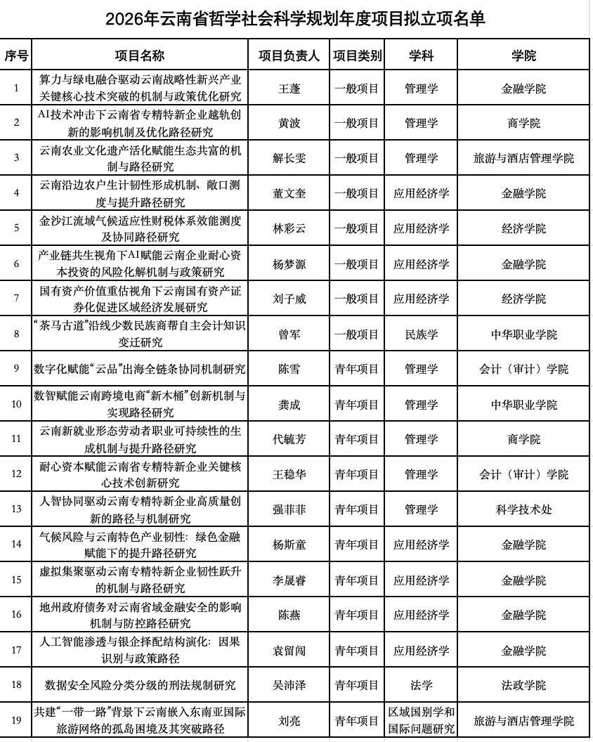 近日,云南省哲学社会科学工作办公室公示了2026年度云南省哲学社会科学规划年度项目拟立项名单,我校19个项目拟获立项资助,拟资助总经费46万元。立项总数位列全省第二。