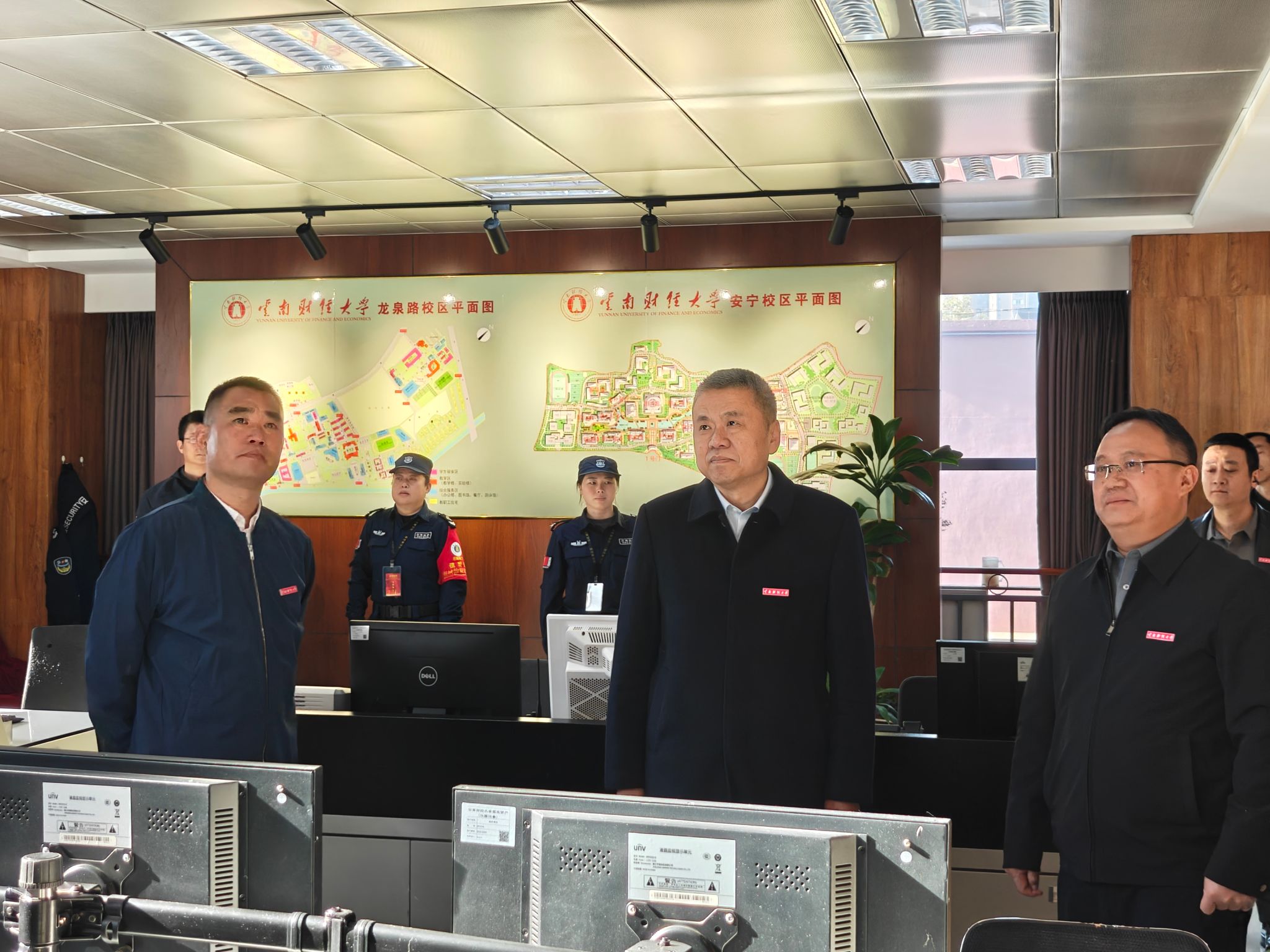 校领导一行先后检查了云南财经大学智慧安防综合管理系统监控中心和各重点区域值班值守情况,走访了南院校医院、专家楼、水电楼、信息中心大楼、高教小区物管中心,以及北院英华餐厅、丹华4栋学生公寓等场所,认真听取了各单位假期工作部署,全面了解了春节期间校园运行保障、应急值守、安全管理、后勤服务等各方面情况,并看望了坚守岗位的一线教职工。每到一处,校领导都与值班人员热情交谈,关切询问他们的工作和生活状况,强调要用心用情做好留校学生的服务保障和校园安全管理工作,及时解决学生遇到的困难,并感谢大家在阖家团圆的时刻仍坚守岗位,为学校的安全稳定和正常运转保驾护航。