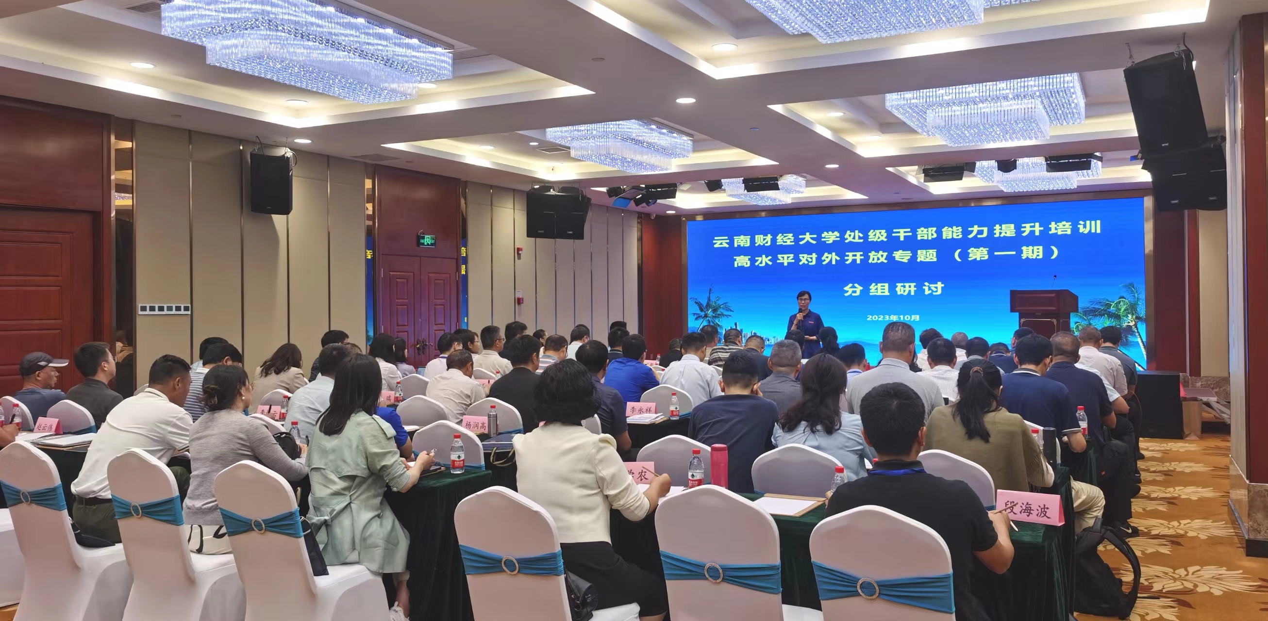 10月27日下午,云南财经大学处级干部能力素质提升培训高水平对外开放专题(第一期)组织学员开展交流研讨。校党委书记王建颖,校党委副书记陈光瑜,校党委委员、副校长李正彪参加研讨。校党委委员、副校长余怒涛作学习成果交流。校党委委员、组织部部长吴应利主持研讨。