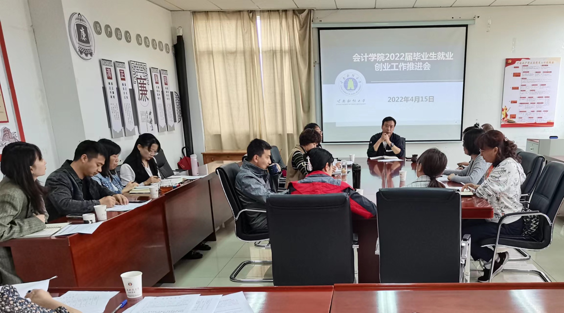 4月15日下午,会计学院在逸夫楼820召开2022届毕业生就业创业工作推进会。学院党委书记徐良金、党委副书记王涛、副处级辅导员张剑锋、学管科科长李淑兰、全体毕业班班主任及部分专任老师参加会议。
