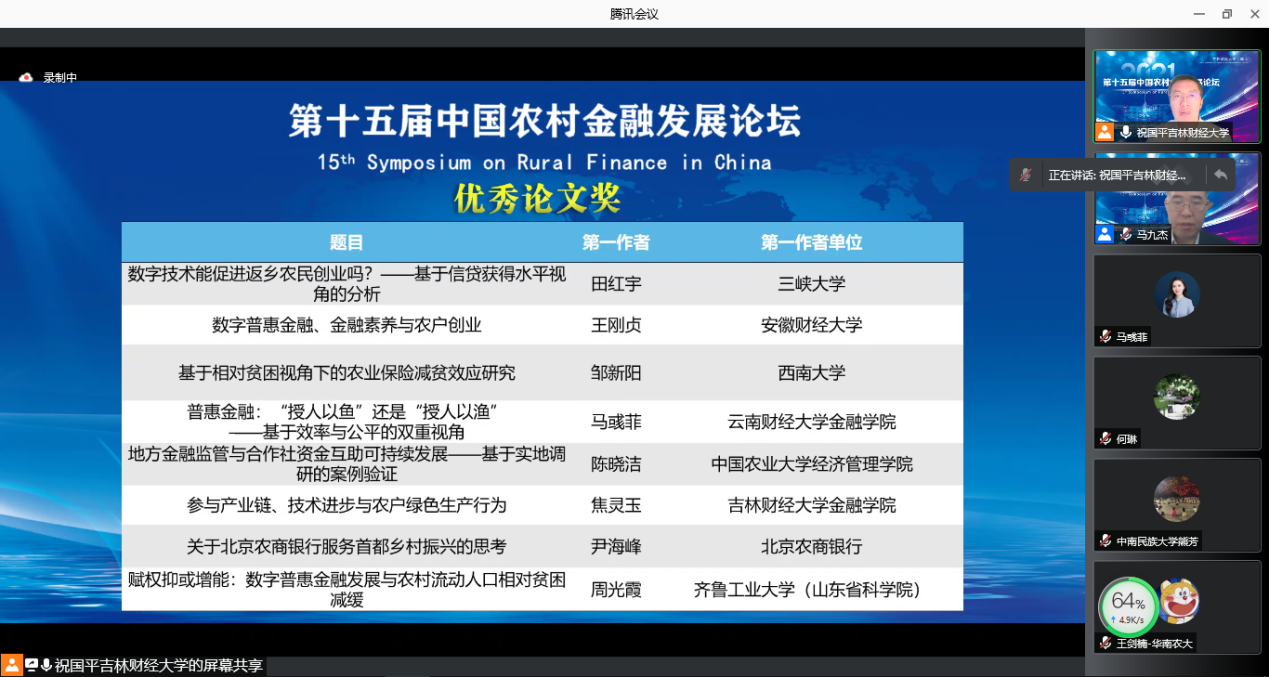 12月11日至12日,由教育部高等学校农经教指委农村金融学教研组主办,吉林财经大学金融学院、中国农业银行吉林省分行及吉林省金融学会承办的第十五届农村金融发展论坛在吉林省长春市举行。受新冠肺炎疫情影响,非吉林省的参会人员均采用线上形式参会。我校金融学院院长熊德平教授应邀参会并主持主旨演讲,金融学院教师黄倩、马彧菲应邀在“数字普惠金融理论与实践”分论坛作报告,熊德平教授团队师生20余人参加线上会议。