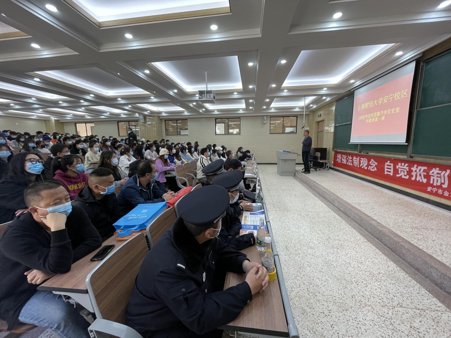 3月4日下午,学生处、保卫处、安宁校区管理办公室联合安宁市公安局、安宁市金方街道办事处在安宁校区开展“法制宣传进校园暨开学安全宣传教育第一课”宣讲活动。安宁校区辖区罗白派出所副所长李伟应邀主讲,活动由保卫处正处级组织员罗强主持,中华职业学院、旅游与酒店管理学院和传媒与设计艺术学院的师生代表参加。
