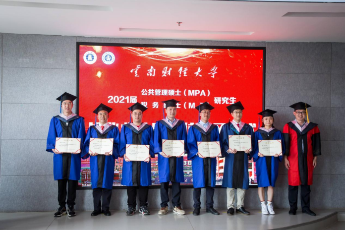 7月3日下午,财政与公共管理学院在逸夫楼410举行2021届公共管理硕士(MPA)、税务硕士(MT)研究生毕业典礼暨学位授予仪式,云南财经大学副校长王敏教授为毕业生拨穗,学院院长缪小林教授颁发学位证书。学院党委书记朱文、副院长韩全芳、和立道及导师代表、毕业生代表近200人参加典礼。