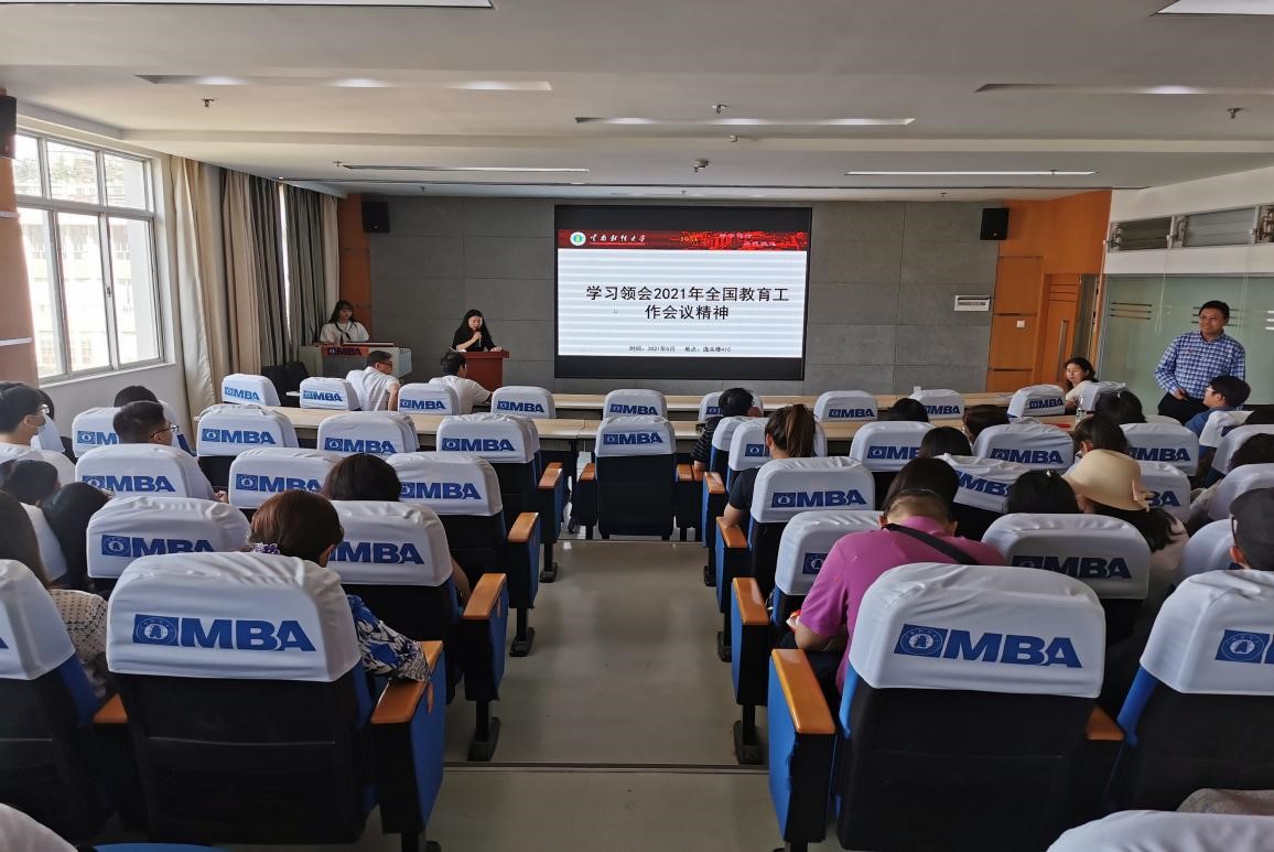 王敏带领商学院全体教职工共同研讨学习“2021年全国教育工作会议精神”,呼吁广大党员干部要贯彻“2021年全国教育工作会议精神”,落实立德树人根本任务,培养德智体美劳全面发展的社会主义建设者和接班人,要持续完善德智体美劳全面培养的育人体系,健全学校、家庭、社会协同育人机制,提升思想政治工作质量,并强调在中国共产党成立100周年背景下,加强党史学习教育的重要性。随后,王敏宣读5月教职工自学专题:《乘势而上,狠抓落实,加快建设高质量教育体系——在2021年全国教育工作会议上的讲话》、《深入学习习近平关于教育的重要论述》,并在会上进行专题研讨。江东书带领大家学习《论中国共产党历史》、《云南财经大学“十四五”发展规划和二〇三五年远景目标纲要》。