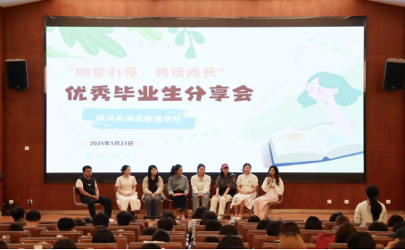 为帮助在校学生获取学习成长经验,促进“三风”建设,5月23日下午,旅游与酒店管理学院在鹏云一附101报告厅举办“朋辈引导,共话成长”优秀毕业生分享会。学院2025届毕业生代表郝洋锦、张林、谷雪静、李伟虹、汪莉莎、杨品薇、段怡菲分别从考研、考公及就业等方面与现场同学交流成长经验。