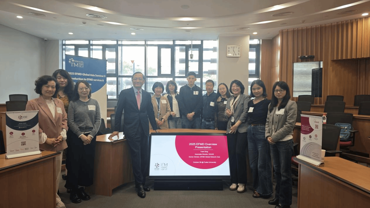 10月28日上午,调研组参加在复旦大学管理学院举办的2025EFMD亚洲研讨会。EFMD亚洲区高级顾问丁远教授从认证官视角解读了EQUIS核心标准和评审要点,指出认证应注重战略一致性、治理结构、师资建设与实践联系。调研组还参加了全球商科教育博览会,学习世界一流商科教育经验。