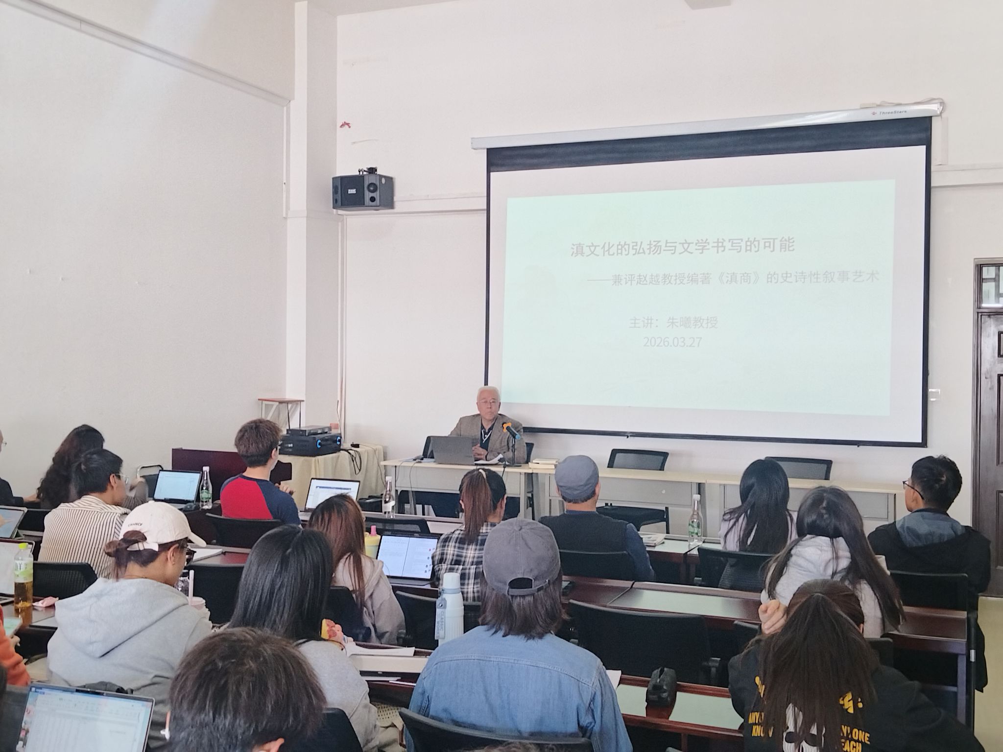 讲座中,朱曦还对我校赵越教授编著的《滇商》一书进行了评鉴。他认为,该书基于滇文化研究的视野,运用创新的文学叙事手法,紧扣云南文化强省建设目标,为文旅产业提质赋能,传递出云南烟火生活的温度,为滇文化的文学书写树立了典范。