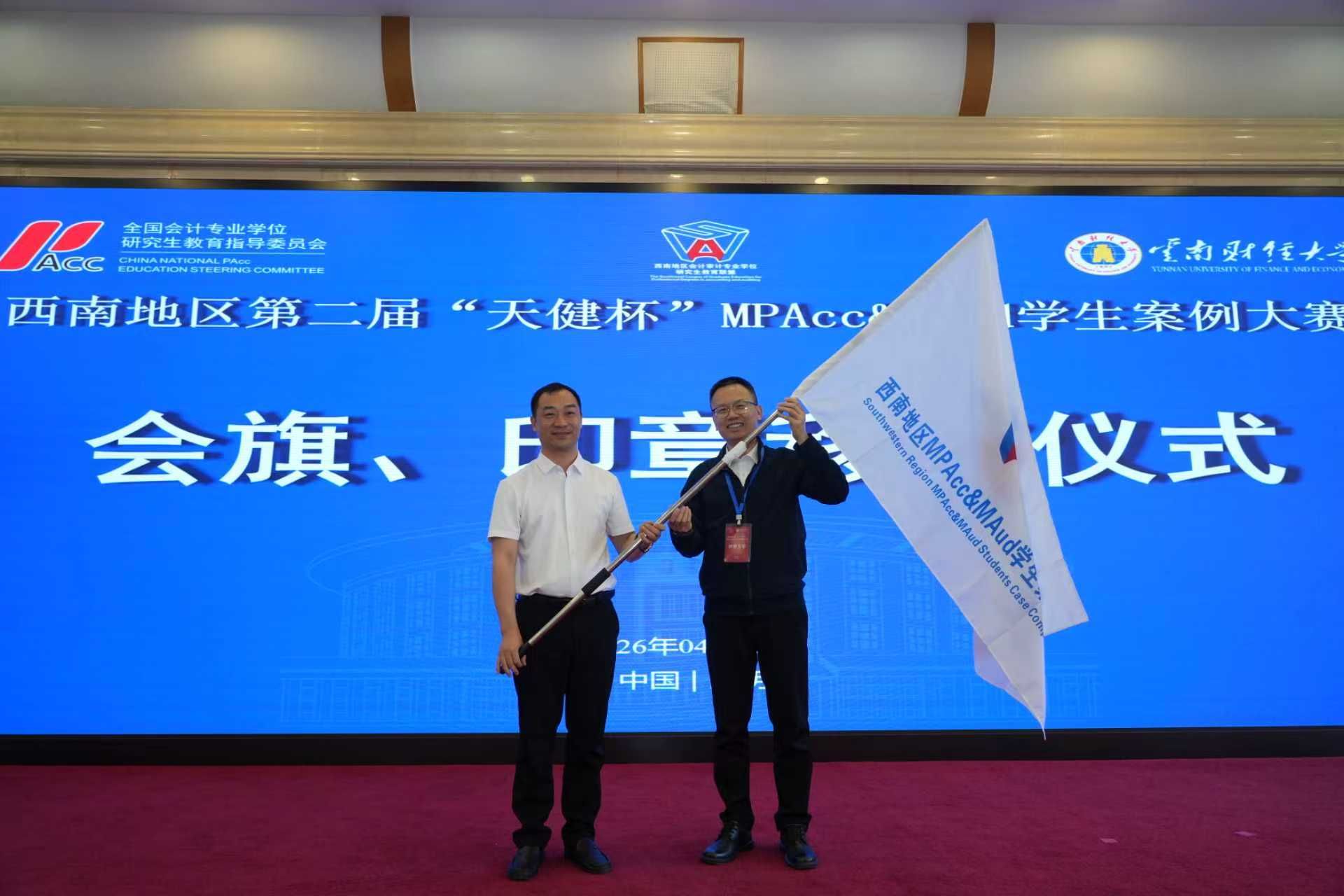 闭幕式上,唐雪松教授将会旗郑重移交至下一届承办单位贵州财经大学会计学院副院长潘文富手中。